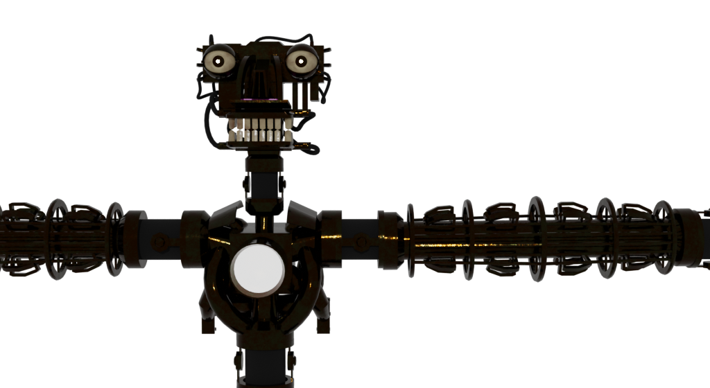 In my usual fashion I started modelling from the arm. Normally I start by modelling the hands of characters, but I started with the arm as I wanted to experiment with the design of it. I was inspired by the animatronic endoskeletons present in the Five Nights at Freddy’s game series, specifically the character Endo 02. I love the design of the rungs on the arms and wanted to design the arms in a similar style, adding lots of detail on the arm then adding loops around to give it volume (plus wire mesh to make it all look seamless).