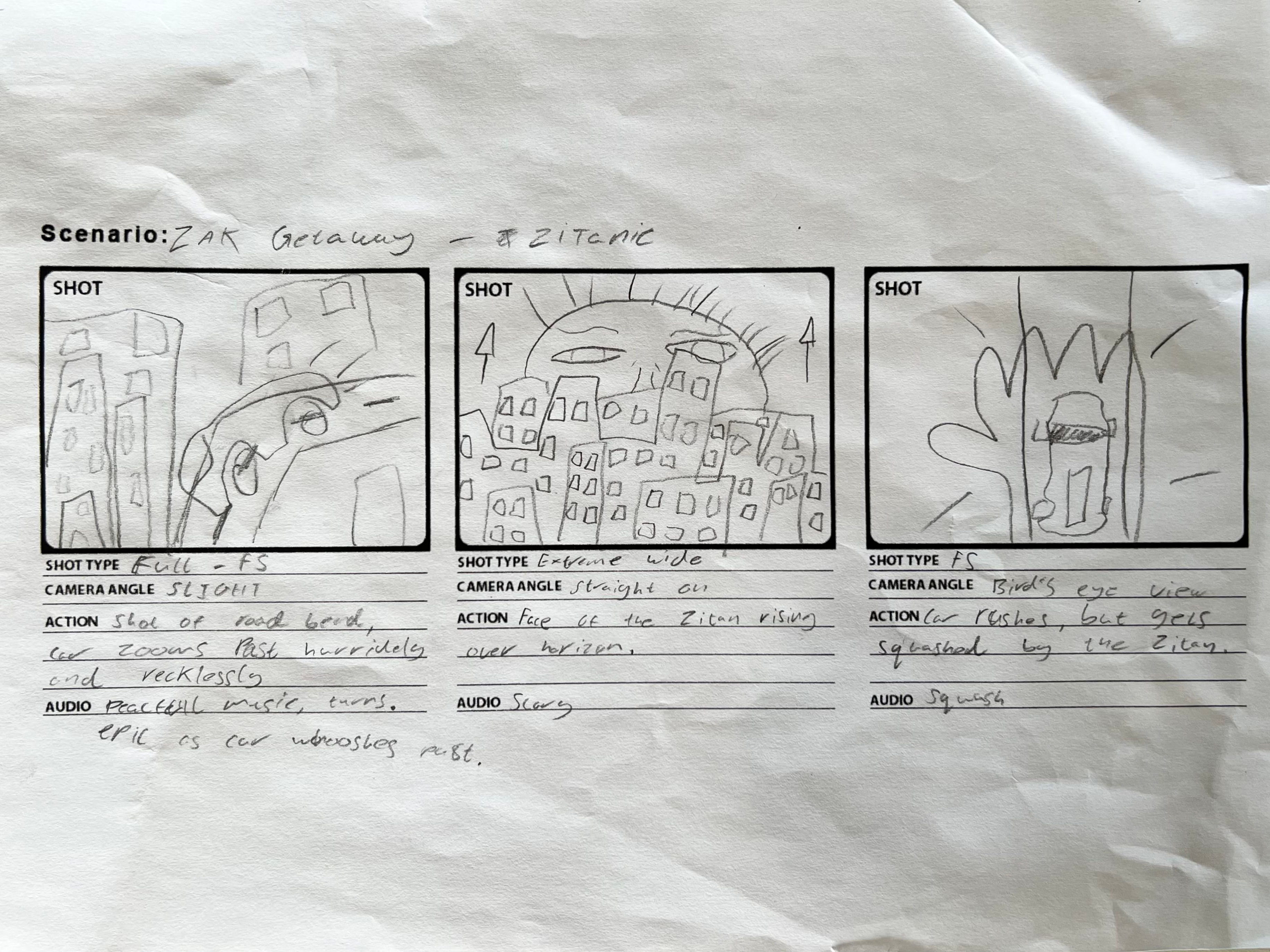 Our second assignment was to film a short animation using our jeep model and including our street sign. The theme was ‘the getaway’, which meant our animation had to follow the jeep model getting away, fleeing or escaping from something. We first had to sketch 2 story boards for potential ideas, one of which we would choose to develop further. For my first storyboard I wanted to recreate a scene from the show Neon Genesis Evangelion, where the jeep would be driving away from the angel Ramiel from the show. My second idea was for the car to be fleeing from a big evil giant.